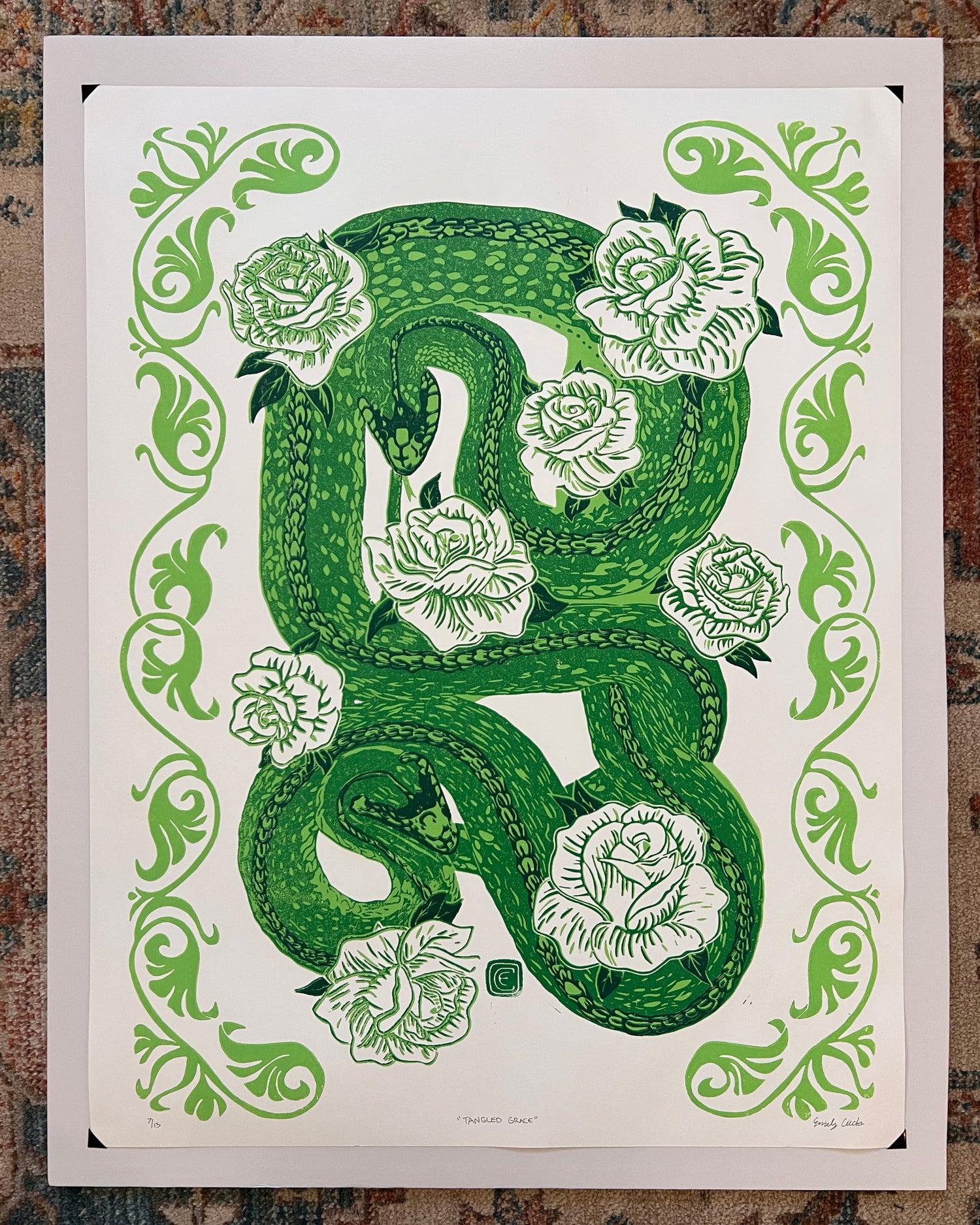 I offer three types of art commissions: ink drawings, linocut prints, and tattoo designs. Learn more about the commission process by clicking the link below. I would love to be a part of bringing your piece to life!