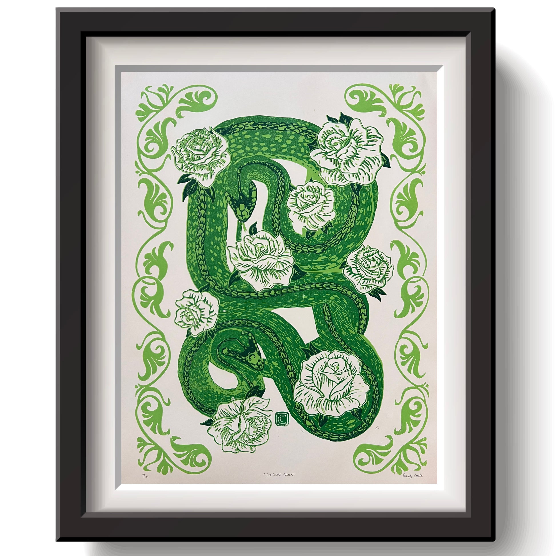 This is an original, limited-edition linocut titled "Tangled Grace."